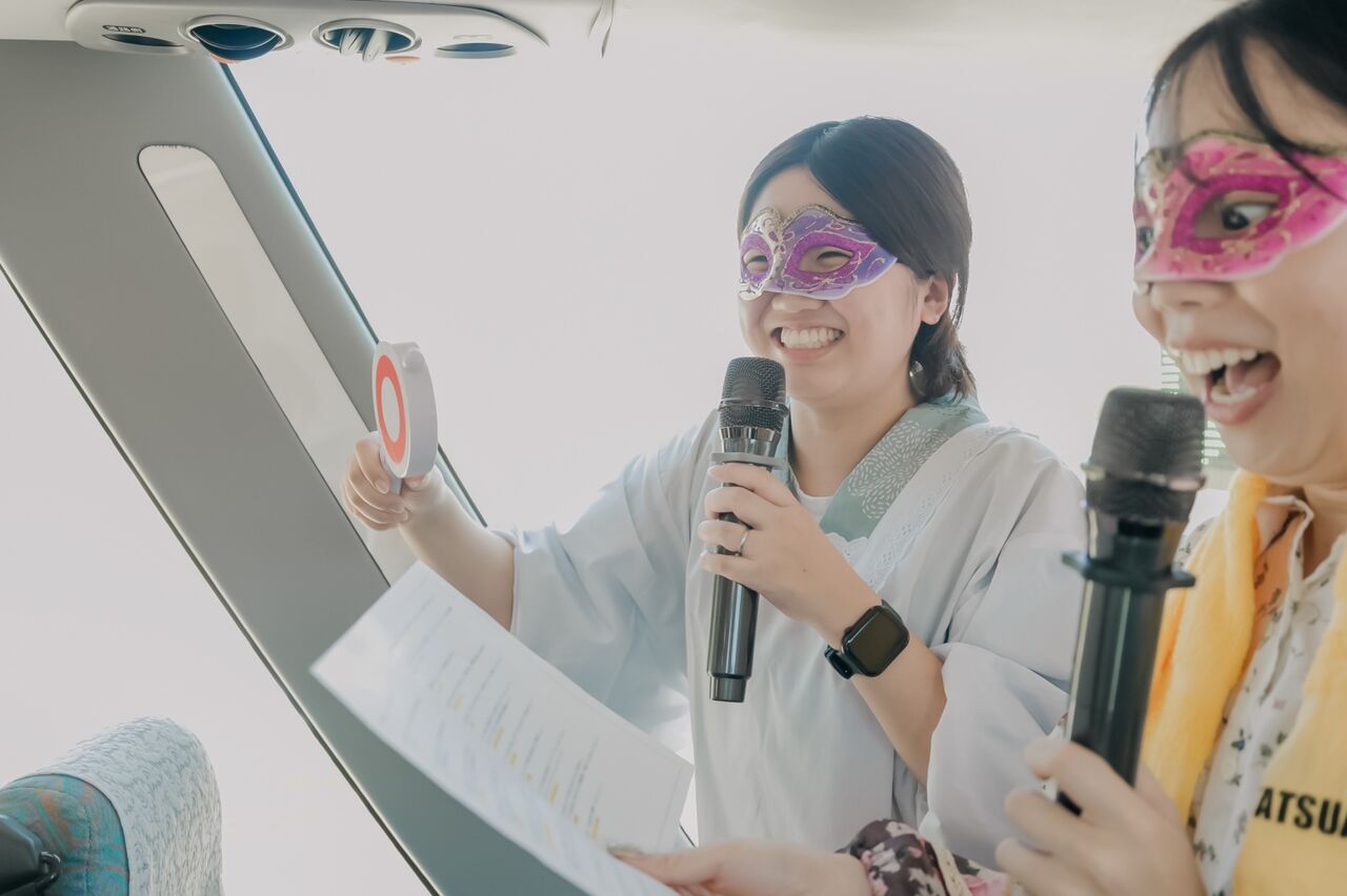 すぐにバスガイドによるバスイベントが始まる。